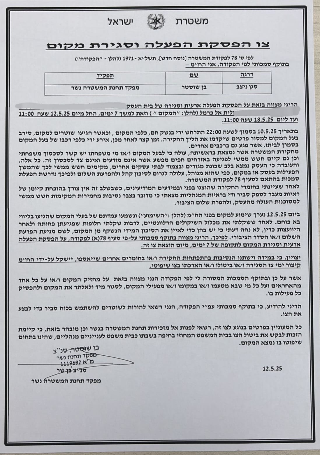 לאחר בחינת הראיות במסגרת החקירה שנפתחה עולה החשש כי המשך הפעלתו של העסק מהווה סיכון מהותי ועלולה לפגוע פגיעה ממשית ומוחשית בשלום הציבור ובטחונו. על כן הוחלט על סגירת העסק בצו מנהלי.