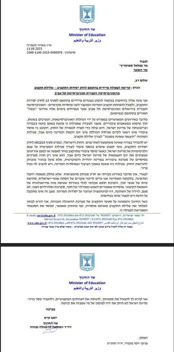מאוניברסיטת תל אביב נמסר בתגובה: "אוניברסיטת תל אביב דוחה בשאט נפש את איומיו של שר החינוך לנקוט בפעולות לא חוקיות ולשלול תקציב מאוניברסיטת תל אביב. אותו שר חינוך, אשר מעולם לא גילה ענין בנעשה באוניברסיטה, לא באנשי ונשות המילואים שלנו, לא בחרמות שמכריזים עלינו מוסדות בעולם, ובוודאי לא בהוראה ובמחקר המתקיימים כאן, מנסה עכשיו להלך עלינו אימים.