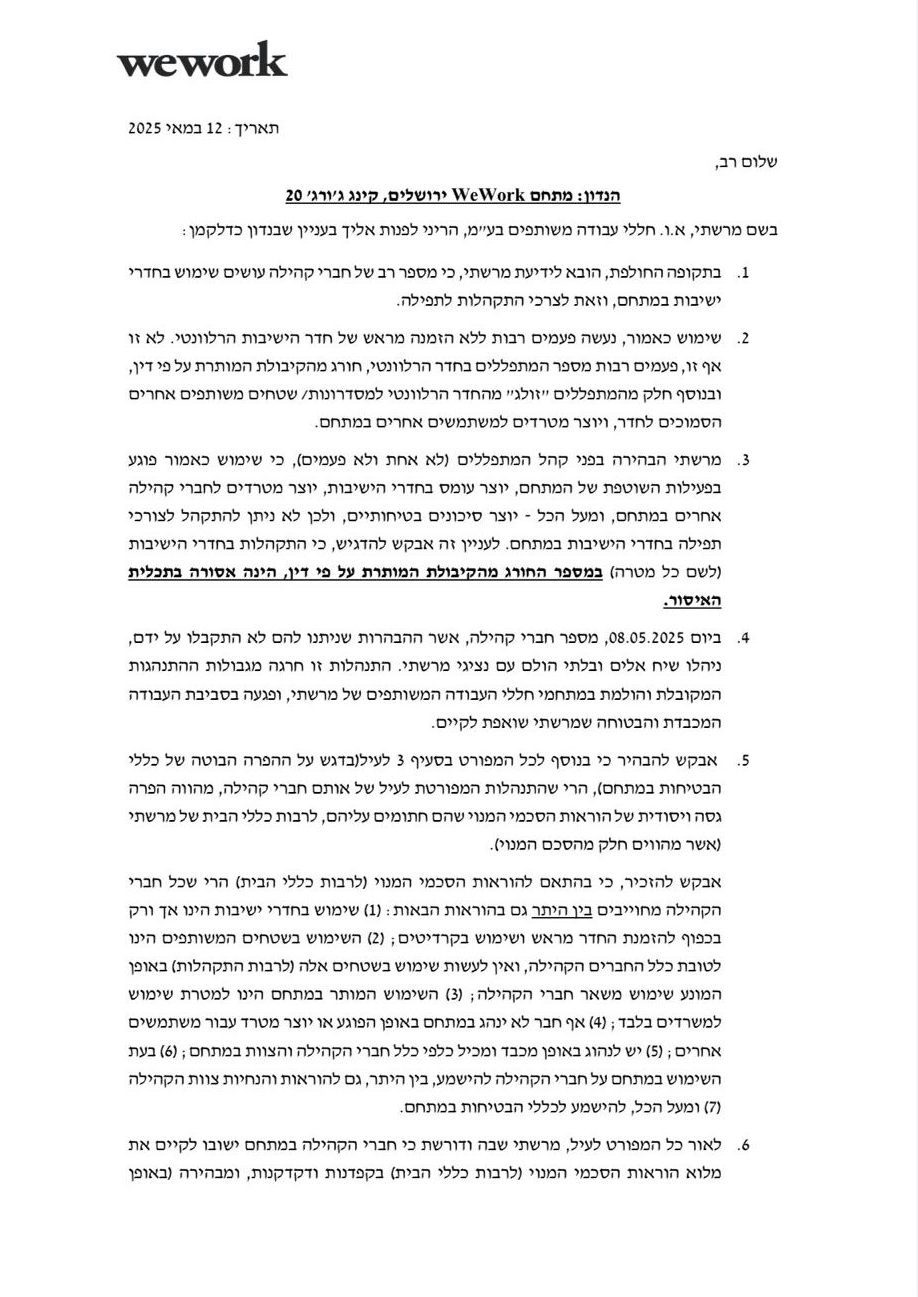 מ-WeWork נמסרה תגובה לפיה: "לצערנו הרב מדובר בסילוף ברור, להלן המכתב בשלמותו (ולא רק 2 הסעיפים האחרונים). מלבד זה נציין שבמתחמים אחרים שלנו בארץ, בהם תנאי החלל מאפשרים זאת, מתקיימות תפילות לבחירת הממברים. כידוע, חברי הקהילה יכולים להתפלל במניין במשרד הפרטי שלהם כל עוד זה עומד במגבלות התפוסה. במתחם בירושלים אין כעת פתרון הולם בשל מגבלות החלל. אין לעניין שום קשר לתפילה, מכל דת."