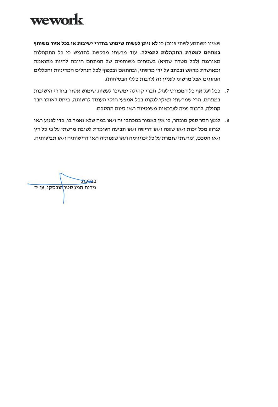 במכתב ההתראה שנשלח אליו נכתב בין היתר: "לא ניתן לעשות שימוש בחדרי ישיבות או בכל אזור משותף במתחם למטרת התקהלות לתפילה… ככל ועל אף כל המפורט לעיל, חברי קהילה ימשיכו לעשות שימוש אסור בחדרי הישיבות במתחם, הרי שמרשתי תאלץ לנקוט בכל אמצעי חוקי העומד לרשותה".