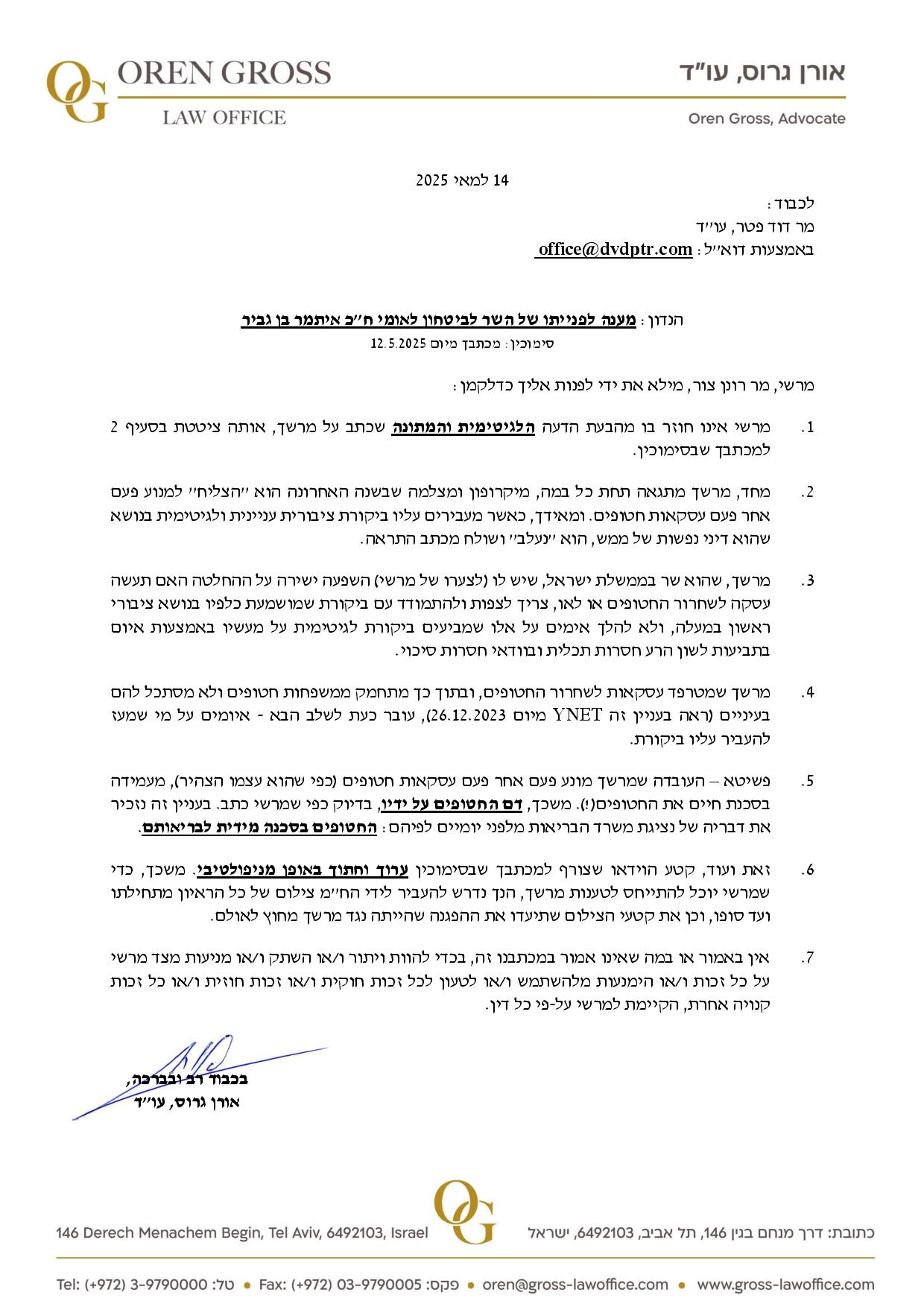 יועץ התקשורת רונן צור הגיב למכתב התראה לפני תביעה ששיגר אליו השר לביטחון לאומי איתמר בן גביר בעקבות פרסום סרטון ממנו משתמע כי השר אמר שלא אכפת לו מהחטופים.