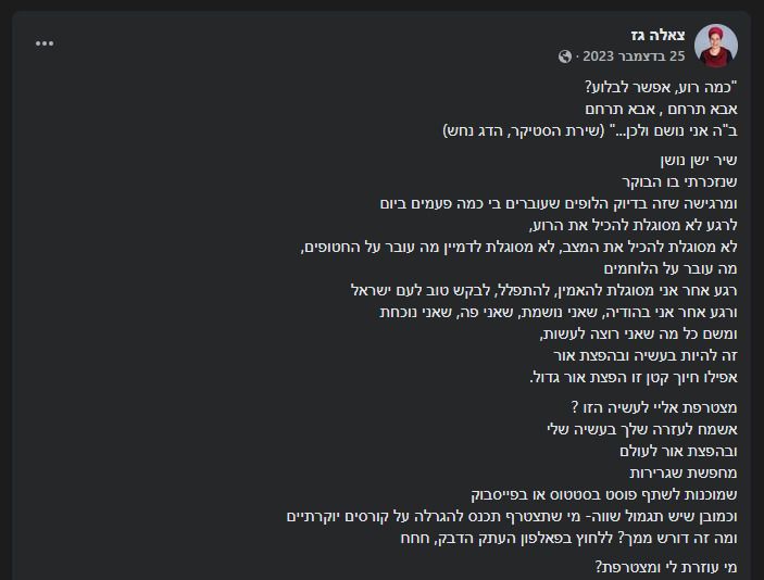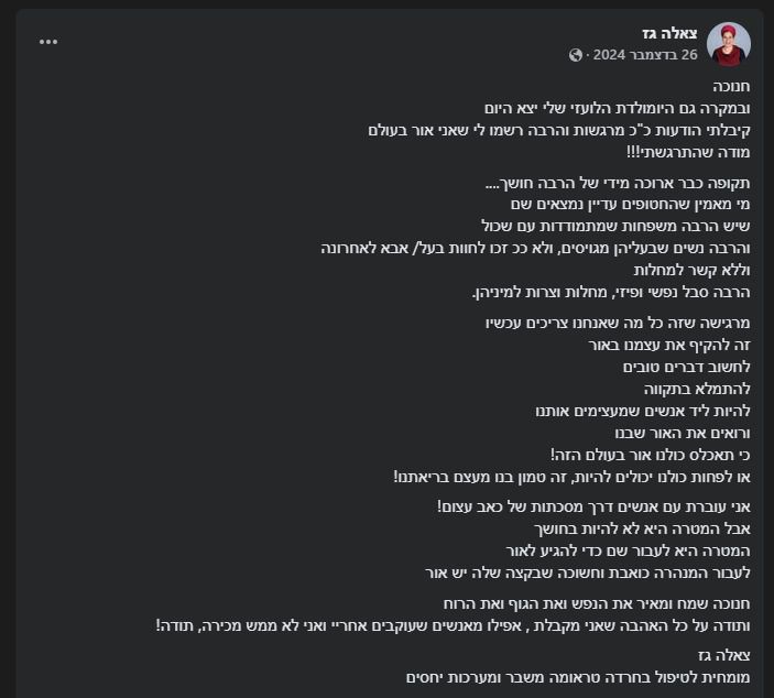 צאלה לא רק דיברה על אור – היא חיה אותו. בפוסט שכתבה בחנוכה האחרון, שהיה גם יום הולדתה הלועזי, היא שיתפה בהתרגשות על הודעות שקיבלה מאוהביה: “קיבלתי הודעות כ"כ מרגשות והרבה רשמו לי שאני אור בעולם… תקופה כבר ארוכה מידי של הרבה חושך… המטרה היא לעבור שם כדי להגיע לאור. לעבור המנהרה כואבת וחשוכה שבקצה שלה יש אור".