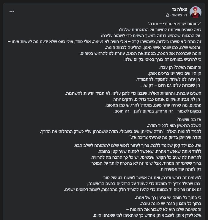 בפוסט האחרון שפרסמה, בינואר האחרון, צאלה כתבה על מנגנוני ההגנה של הנפש, והציעה דרך רגישה להתמודד איתם. כך היא כתבה: “לחומות שבניתי סביבי – תודה… הן שומרות עלינו גם היום – רק ש… מה שהיה עוזר פעם, מתחיל להרגיש כמו מחסום… השלב הראשון הוא להכיר תודה… ואז, כמו ילד קטן שלומד ללכת, צריך לעזור לנפש שלנו להתפתח לשלב הבא".