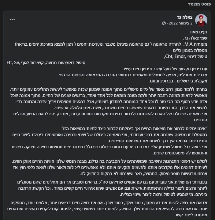 צאלה גז האמינה שגם במציאות קשה, יש לאדם את הכוח לבחור כיצד לחיות. כמטפלת בעלת תואר שני, עם ניסיון של למעלה מעשור בטיפול בחרדה, טראומה (כולל טראומה מינית), משברים ומערכות יחסים, היא שילבה כלים מגוונים – טיפול דינמי, CBT, EMDR, EFT, SE וטיפול בתנועה – כדי להתאים את הטיפול לכל מטופל. בפוסט היכרות שכתבה ונעצה בעמוד הפייסבוק שלה, היא הציגה את תפיסת עולמה: