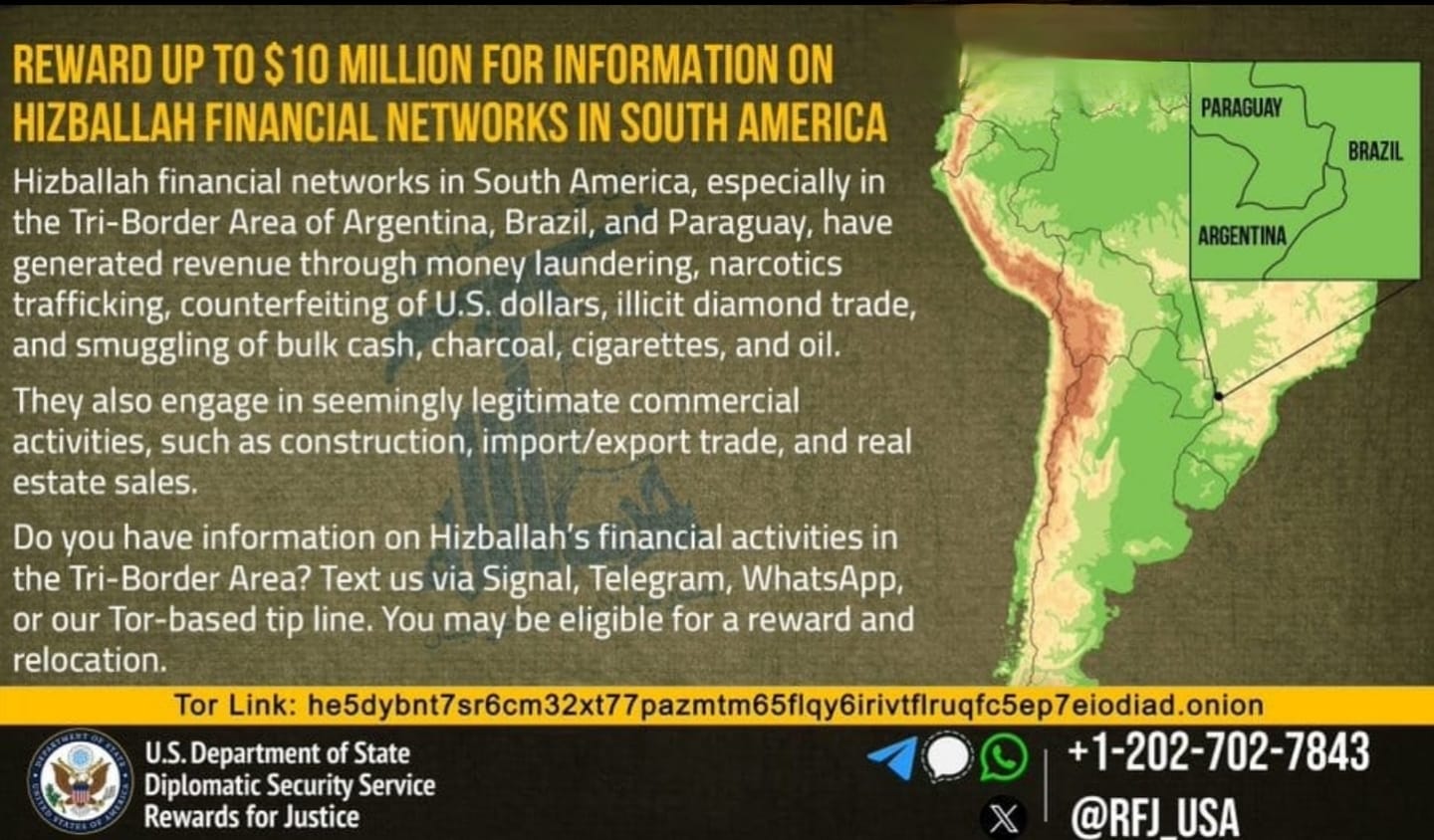 משרד המשפטים האמריקאי הכריז בימים האחרונים על פרס כספי של עד 10 מיליון דולר למי שיספק מידע מהימן על רשתות המימון של ארגון חיזבאללה בדרום אמריקה – ובעיקר באזור המכונה "משולש הגבולות", שבו נפגשות ארגנטינה, ברזיל ופרגוואי.
