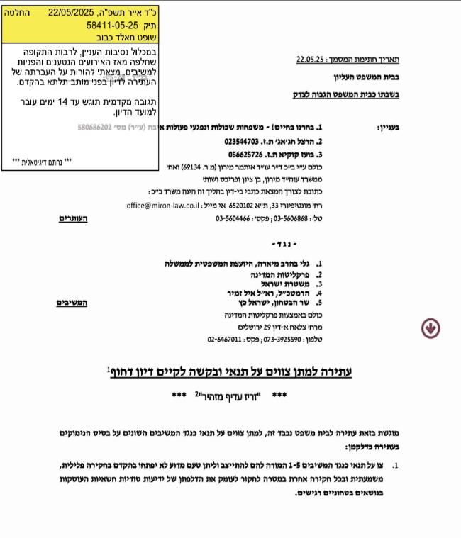 בית המשפט העליון הורה היום להעביר לדיון בהקדם את העתירה שהוגשה על ידי פורום “בוחרים בחיים” של המשפחות השכולות ונפגעי הטרור, נגד היועצת המשפטית לממשלה. העתירה, שעניינה סירובה המתמשך של היועצת לחקור שורת הדלפות ביטחוניות חמורות, טוענת כי ההדלפות פגעו בביטחון המדינה ויש לחקור אותן מיידית. בג”ץ קבע כי היועצת תגיש את תשובתה לעתירה עד 14 יום לפני מועד הדיון.