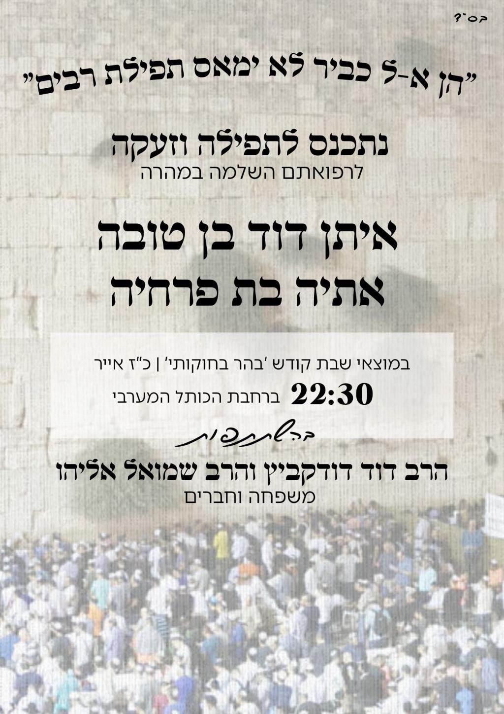 במוצאי השבת הקרובה תיערך תפילה לרפואתם בכותל, בהשתתפות הרב שמואל אליהו והרב דודי דודקביץ'. הציבור מתבקש להתפלל לרפואתם של איתן דוד בן טובה ואתיה בת פרחיה.