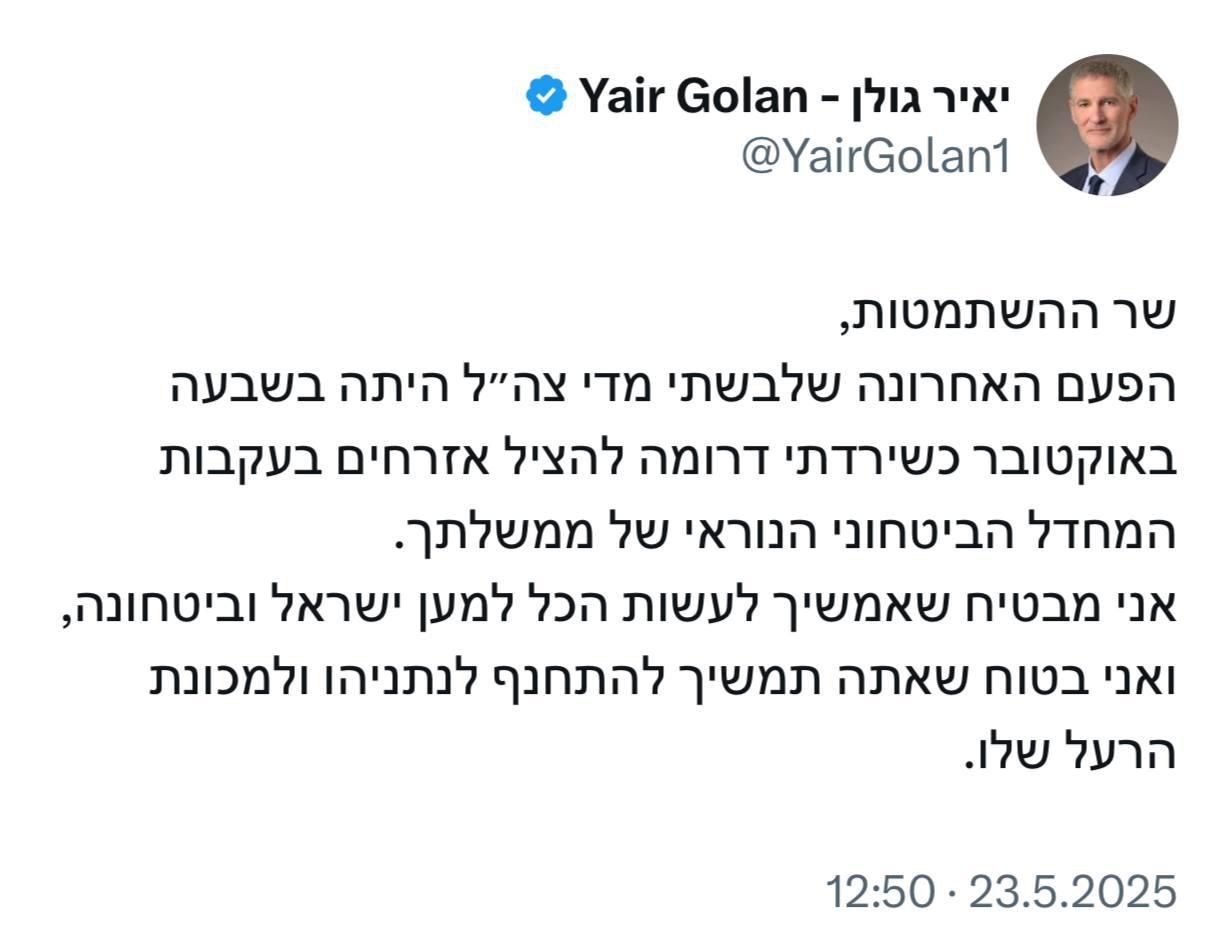 ברשת X כתב גולן: ״שר ההשתמטות, הפעם האחרונה שלבשתי מדי צה״ל היתה בשבעה באוקטובר כשירדתי דרומה להציל אזרחים בעקבות המחדל הביטחוני הנוראי של ממשלתך".