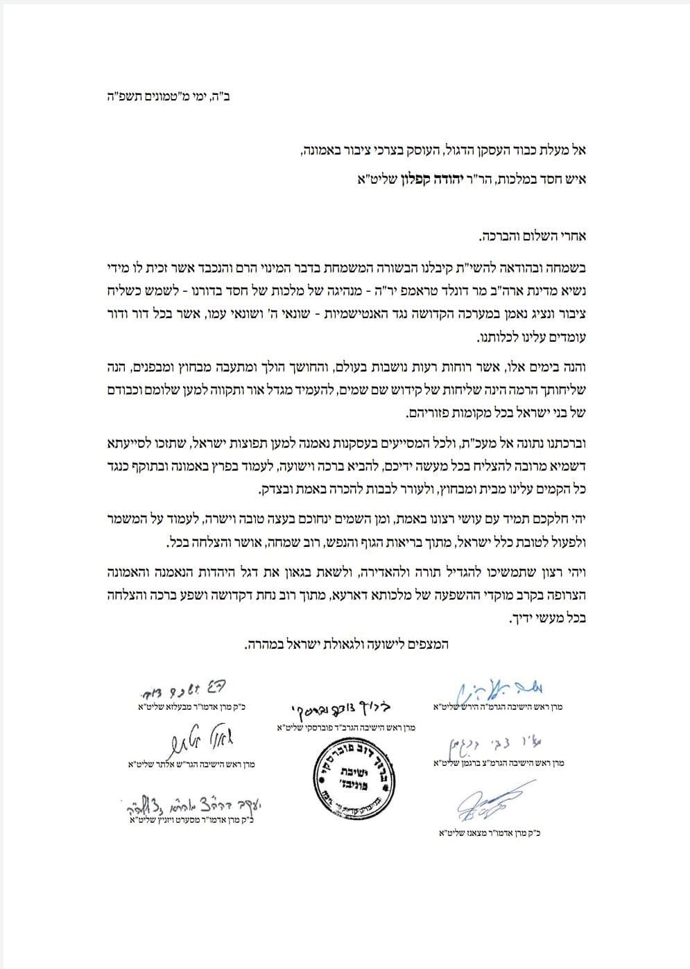 "בשמחה ובהודאה לה' קיבלנו את הבשורה המשמחת בדבר המינוי הרם והנכבד אשר זכית לו מידי נשיא ארה"ב דונלד טראמפ – מנהיגה של מלכות של חסד בדורנו – לשמש כשליח ציבור ונציג נאמן במערכה הקדושה נגד האנטישמיות – שונאי ה' ושונאי עמו, אשר בכל דור ודור עומדים עלינו לכלותנו" נאמר במכתב. "והנה בימים אלו, אשר רוחות רעות נושבות בעולם, והחושך הולך ומתעבה מבחוץ ומבפנים, הנה שליחותך הרמה הינה שליחות של קידוש שם שמים, להעמיד מגדל אור ותקווה למען שלומם וכבודם של בני ישראל בכל מקומות פזוריהם".