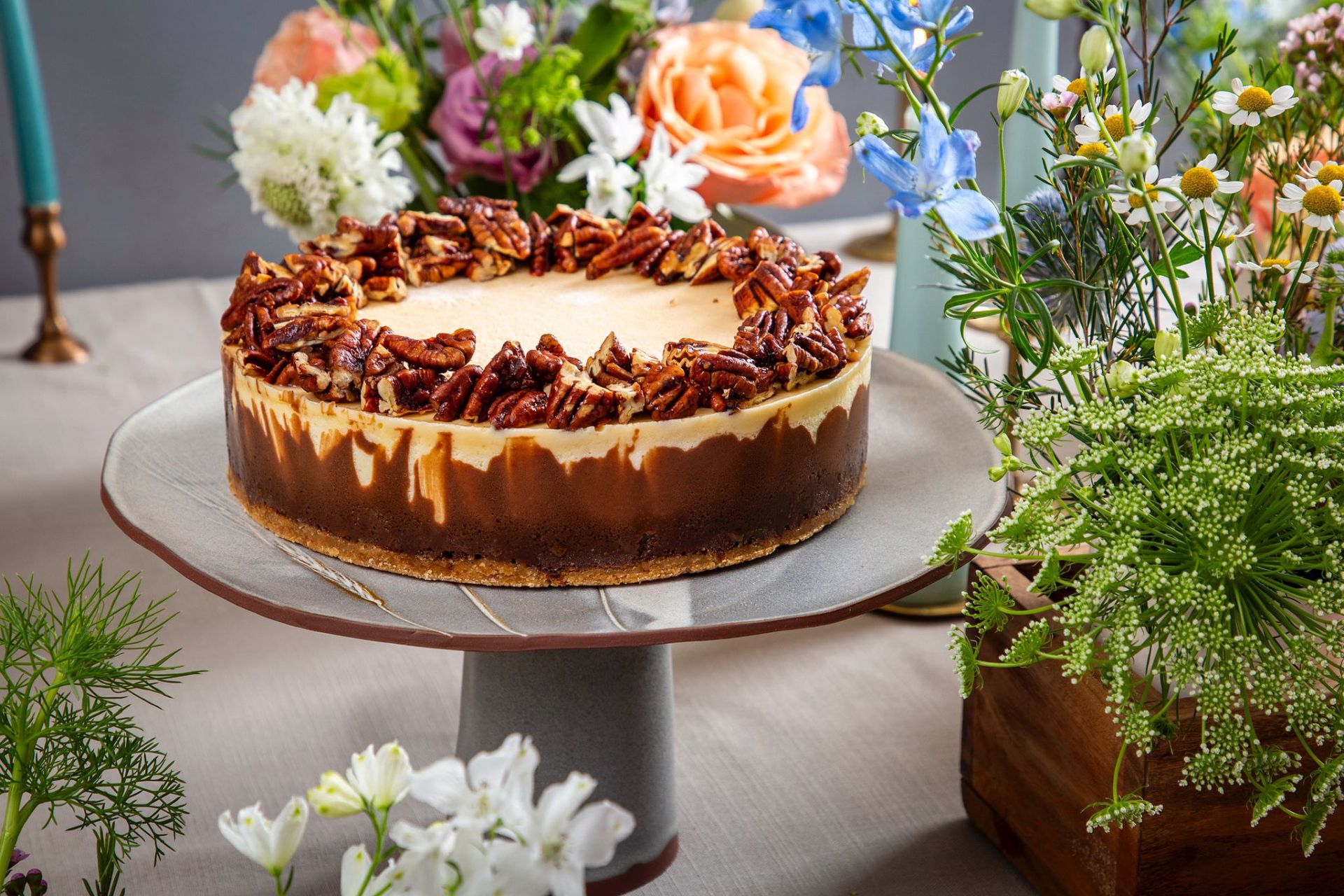 באסקית בראוניס – שכבת שטרוייזל דקה, בראוניס שוקולד חלב, גבינה אפויה באסקית, בציפוי אנגלז וניל ופקאנים מקורמלים.
