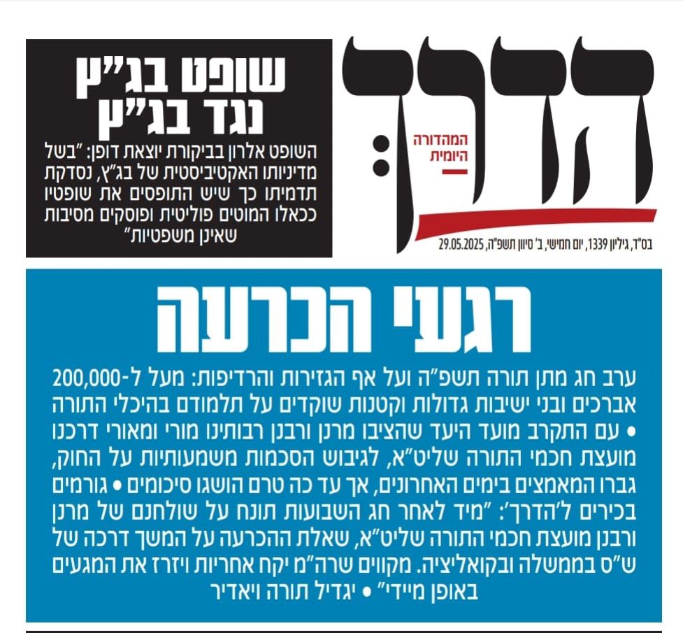 הכותרת בעיתון: "עם התקרב מועד היעד שהציבו מרנן ורבנן רבותינו מורי ומאורי דרכנו מועצת חכמי התורה שליט"א, לגיבוש הסכמות משמעותיות על החוק, גברו המאמצים בימים האחרונים, אך עד כה טרם הושגו סיכומים".