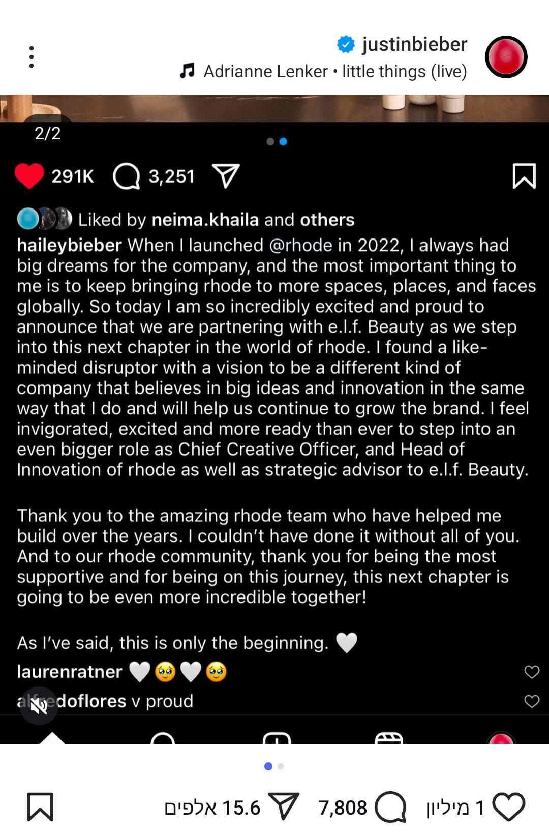 הרכישה של Rhode על ידי e.l.f. Beauty נחתמה תמורת מיליארד דולר, כאשר 800 מיליון דולר שולמו במזומן ובמניות, ו-200 מיליון דולר נוספים ישולמו כתשלום עתידי בהתאם לביצועי המותג. ביבר תמשיך לכהן כראש הקריאייטיב והחדשנות של Rhode, תפקיד שיאפשר לה להמשיך לעצב את עתיד המותג. בהצהרה רשמית מסרה ביבר: “אני גאה מאוד במה שהשגנו עם Rhode, ומצפה להוביל את המותג לשלב הבא בשותפות עם e.l.f. Beauty.”
