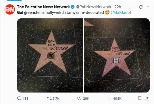 אתמול (רביעי), הופצו תמונות ברשתות החברתיות של הכוכב של השחקנית הישראלית גל גדות בשדרת הכוכבים של הוליווד, כשהוא מושחת. בתגובה מהירה, ישראלים מקומיים הגיעו לשדרה כדי לנקות את הכוכב ולהשיב לו את כבודו.