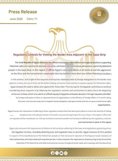 "לאור הבקשות והפניות הרבות הקשורות לביקורים מצד משלחות זרות באזור הגובל בעזה, במיוחד בעיר רפיח והאזורים הסמוכים, הרפובליקה הערבית של מצרים מדגישה את הצורך באישור מוקדם עבור ביקורים אלה. הדרך היחידה לרשויות המצריות לשקול את הבקשות, תוך התחשבות בצרכים הביטחוניים והרגולטוריים, היא באמצעות פנייה רשמית מממשלת המדינה המעוניינת או באמצעות בקשה רשמית של הארגון בו מדובר, אשר תוגש למשרד החוץ המצרי. זאת כדי לתאם ביקור בשטח המצרי.