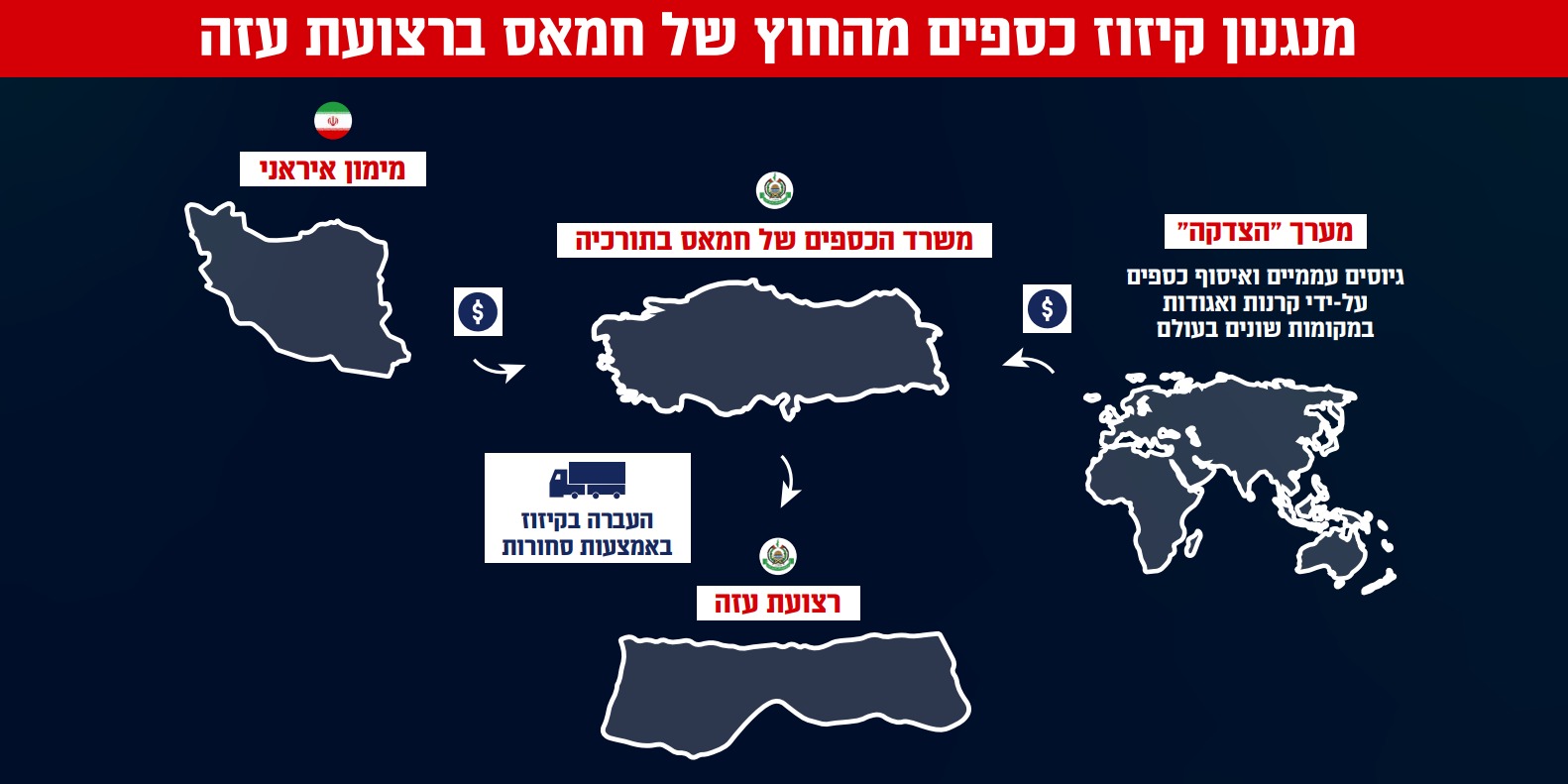 מנגנון קיזוז כספי: חמאס קיבל מאות מיליוני שקלים מאיראן ומקורות נוספים דרך מערכת "חוואלה" בתורכיה. הארגון דרש הכנסת סיוע "עודף" שנרכש מכספו, מכר אותו במחירים גבוהים והפך אותו למזומן.
