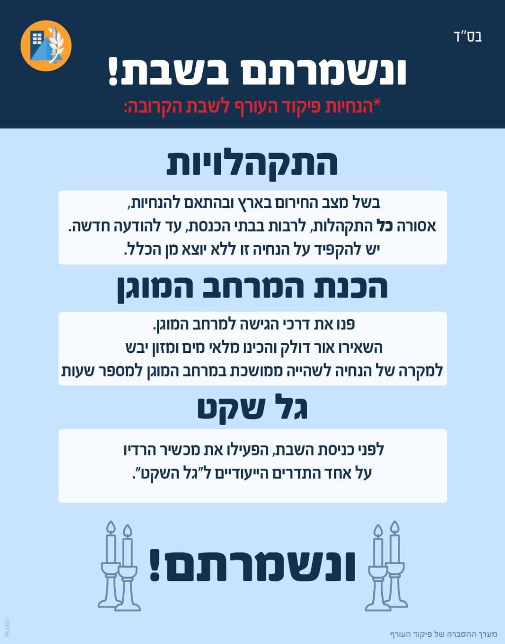 לאור מצב החירום, הוחלט בפיקוד לאסור את פתיחת בתי הכנסת, זאת בתיאום עם הרבנים הראשיים, כמו כן לא תהיינה התקהלויות. לגבי התרעה מקדימה על תגובה אפשרית מאיראן מדגיש הגורם הבכיר כי השאיפה היא לתת עשר דקות התראה בהתאם למה שמופיע במערכות.