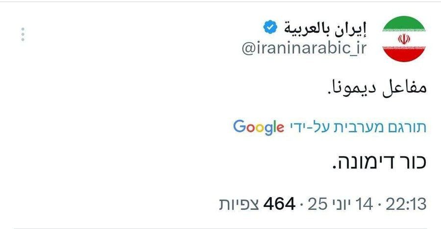 חשבונות הרשתות החברתיות הרשמיים של משטר האייתולות בטהראן שיגרו אזהר מסוכנת כלפי ישראל, ואיימו באופן ישיר לכוון לכור בדימונה בתקיפה הקרובה.