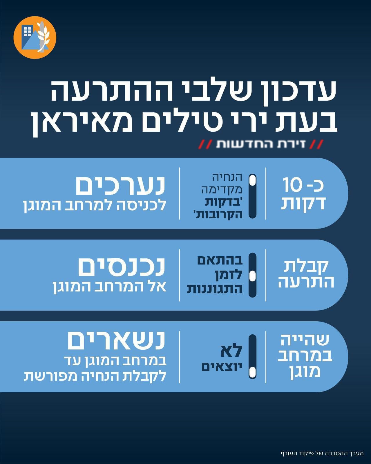 כלומר, אלו הם שלבי ההתרעה העדכניים בעת ירי טילים מאיראן: כ-10 דק' לפני הירי- תצא ”הנחיה מקדימה” על מנת להיערך לכניסה למרחב המוגן. לאחר מכן, בעת קבלת התרעה נכנסים למרחב המוגן – על פי זמן ההתגוננות העומד לרשותך, ולבסוף – יציאה מהמרחב המוגן- רק בעת קבלת הודעה חדשה לצאת מהמרחב המוגן.