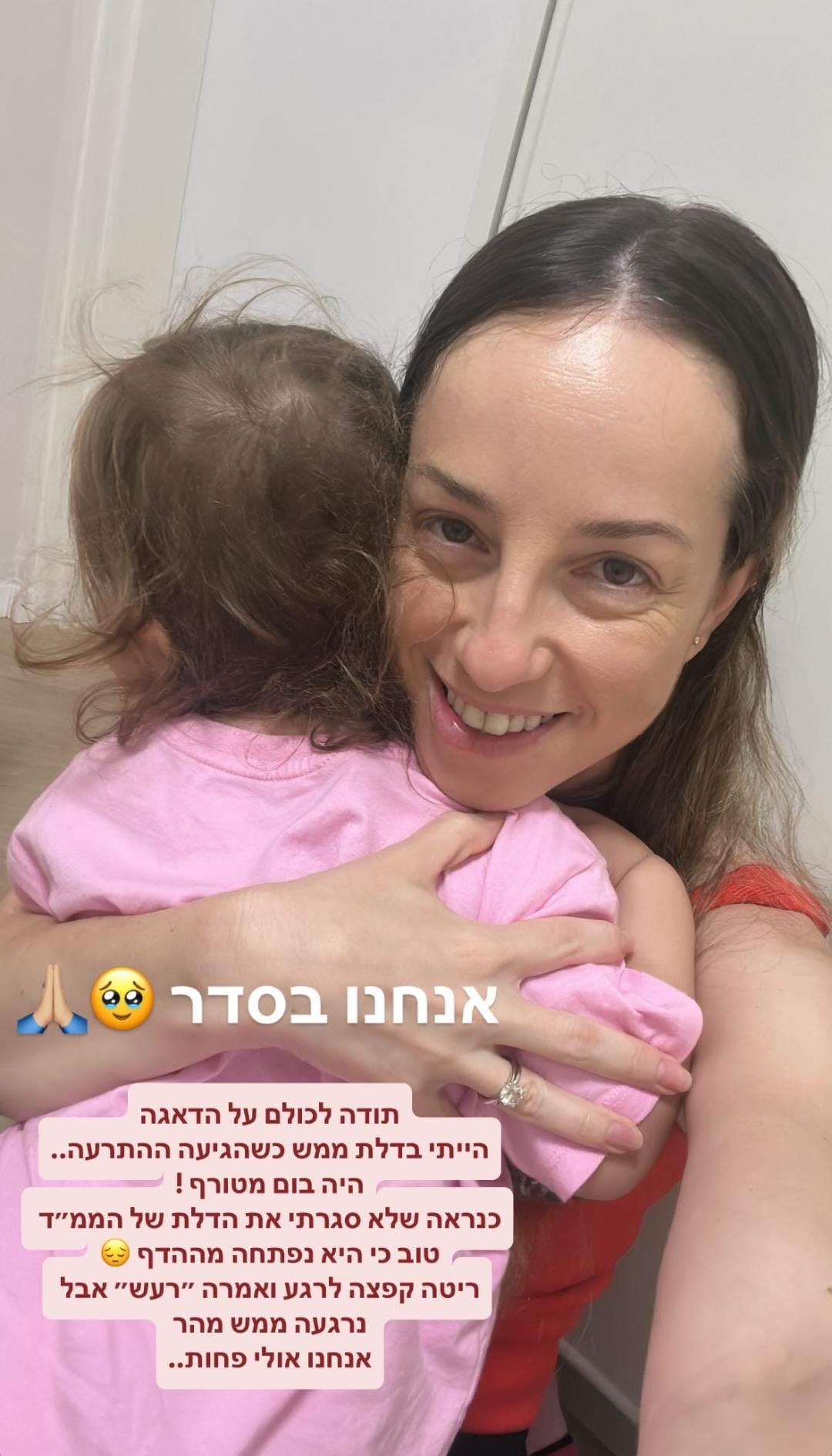 זה התחיל באזעקה הבוקר, שתפסה את בני המשפחה בבית. אברבוך העלתה תמונה שלה עם ביתה ריטה מהממ"ד וכתבה: "אנחנו בסדר. תודה לכולם על הדאגה. הייתי בדלת ממש כשהגיעה ההתרעה. היה בום מטורף! כנראה שלא סגרתי את הגלת של הממ"ד טוב כי היא נפתחה מההדף".
