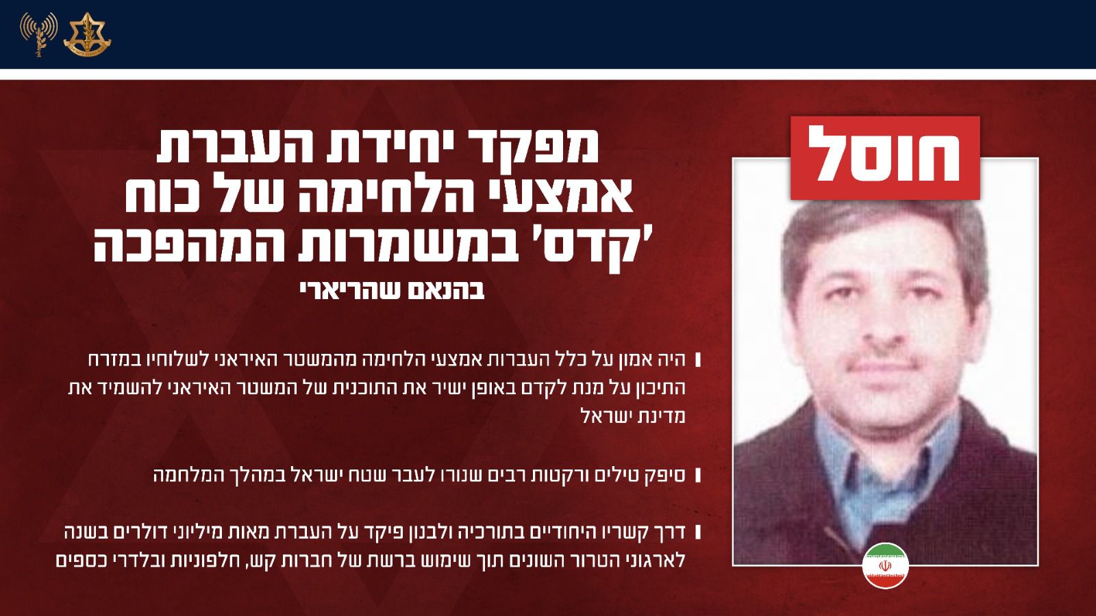 חיסול דרמטי נוסף: במהלך הלילה (שבת), מטוסי קרב של חיל האוויר תקפו וחיסלו את מפקד יחידת העברות אמצעי הלחימה (190) של כוח ׳קדס׳ במשמרות המהפכה, בהנאם שהריארי. בצה"ל אמרו כי שהריארי חוסל ברכבו, יותר מ-1,000 ק״מ ממדינת ישראל בזמן שנסע במערב איראן.