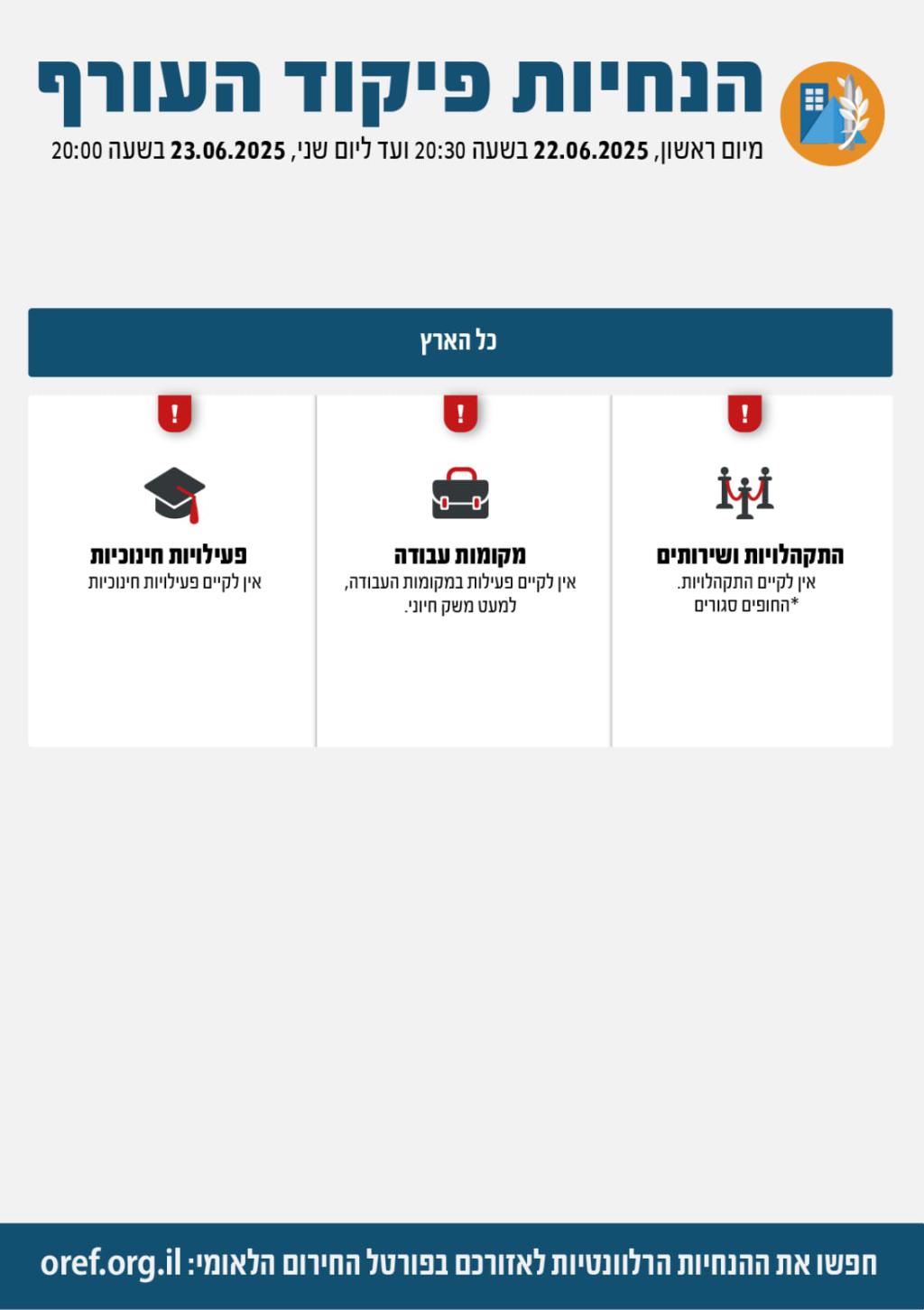 דובר צה״ל הודיע לפני זמן קצר כי בתום הערכת המצב, מדיניות ההתגוננות של פיקוד העורף נשארת ללא שינוי ובתוקף עד ליום ב׳, 23 ביוני 2025, בשעה 20:00.