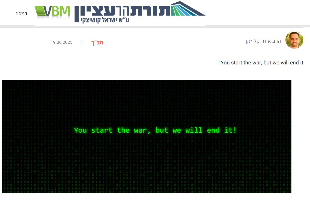 מבצע עם כלביא היום ה-11. כשאי אפשר לפגוע בעורף בטילים עוברים לסייבר. אתר ישיבת הר עציון (הגוש) נפרץ על ידי האקרים – ככל הנראה איראנים – שהחליפו את הכיתוב בדפי השיעורים לטקסט אחר.