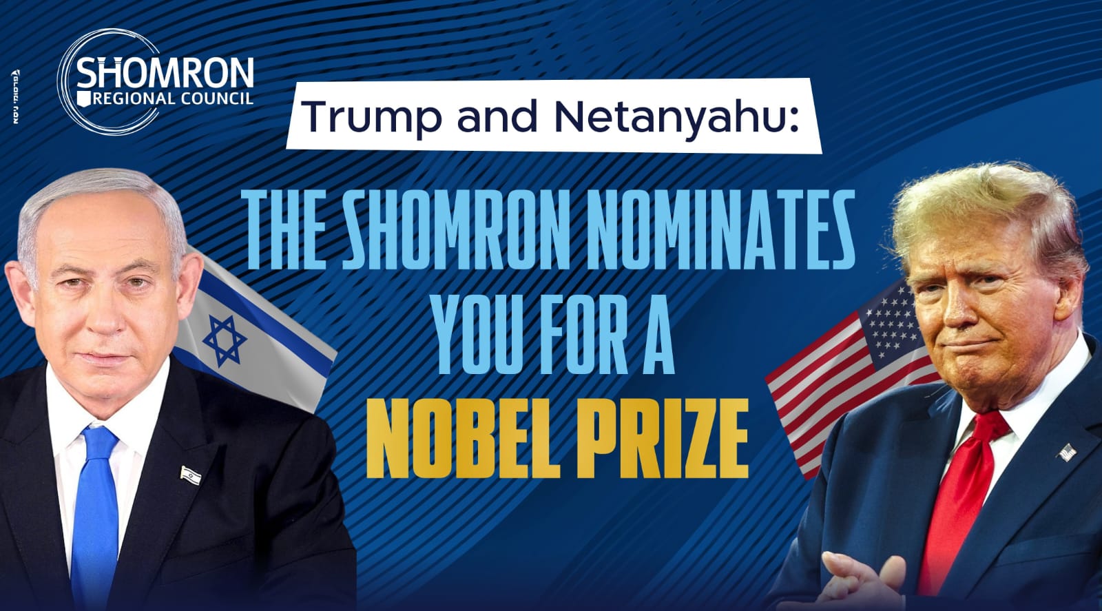 במסגרת הקמפיין, ייתלו שלטי תמיכה בישראל בארצות הברית ובאירופה, בסיוע כספי של ידידי השומרון בישראל ובארה"ב. אחד המקומות הבולטים בו ייפרש שלט הוא "המרפסת הלאומית ע"ש דונלד טראמפ" ב"מרכז גוטניק" שבפדואל שבשומרון.1 יש לציין כי לפני מספר חודשים הודיע יוסי דגן כי "המרפסת של המדינה" בפדואל תיקרא על שם דונלד טראמפ, והנשיא טראמפ עצמו אף שיתף את הצהרתו של דגן בעמוד האישי שלו ברשת החברתית "truth". על השלטים נכתב באנגלית: "Trump and Netanyahu: The Shomron nominates you for a Nobel Prize" (טראמפ ונתניהו: השומרון מציע את מועמדותכם לפרס נובל).