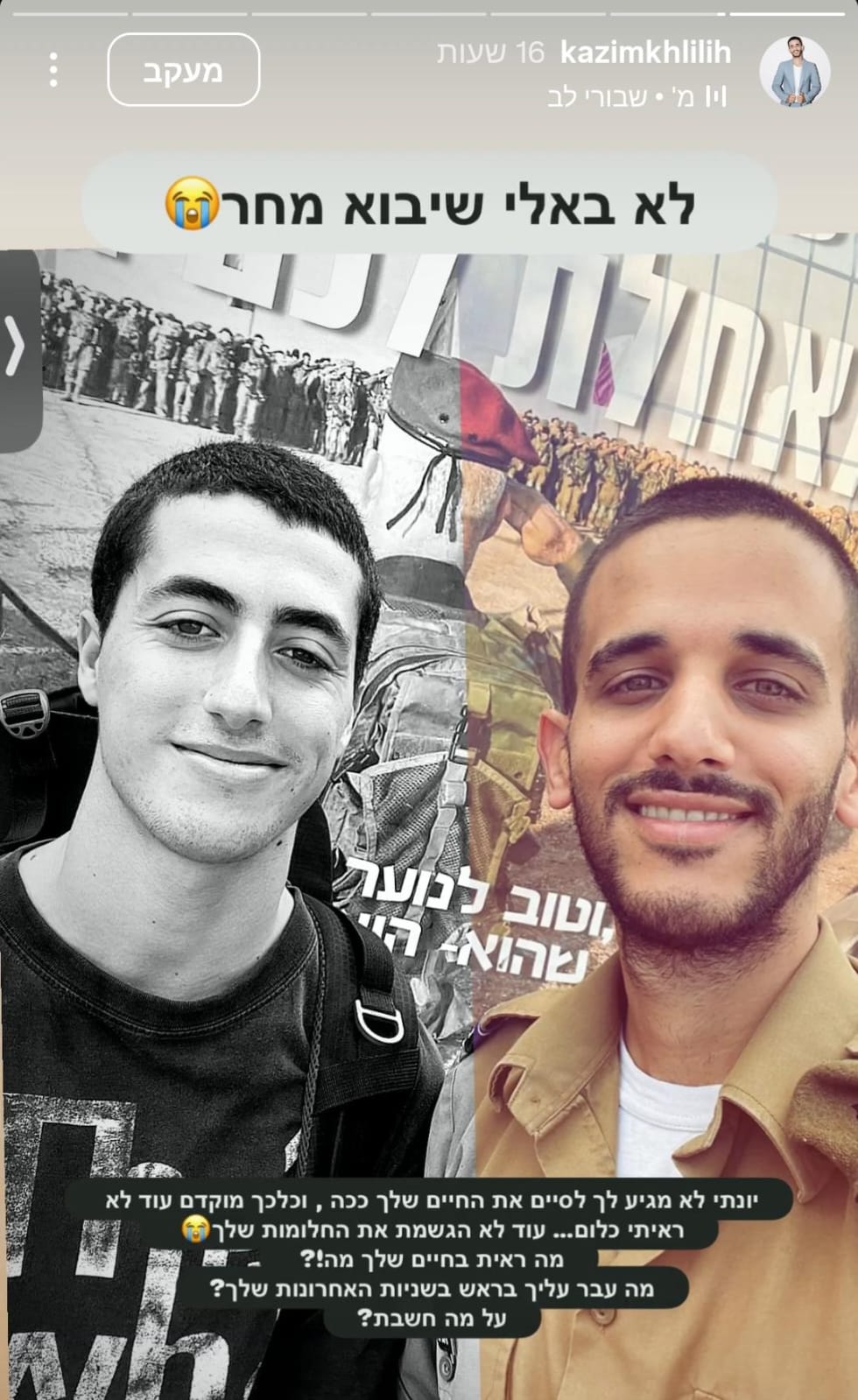 המשפיען שיתף גם סרטון של השניים, והוסיף: "החיוך הכי מושלם של יונתי". הוא הבהיר את עמדתו כלפי עזה והמתגוררים בה: "בחיים לא יהיה אצלי מקום בלב לחמלה לעזתים! לקחו את יונתן ואת הבן דודה שלי. תגידו מה שאתם רוצים אין חמלה ולא תהיה אצלי!"