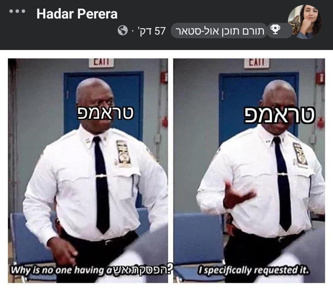 בעיצומה של ההמולה, הישראלים, כהרגלם, פנו להומור. הרשתות החברתיות התמלאו בממים קורעים מצחוק שתפסו את האבסורד, המתח והדרמה של היום הזה. הנה מבחר הממים ששיגעו את הרשת, כי אם לא נצחק, נבכה.