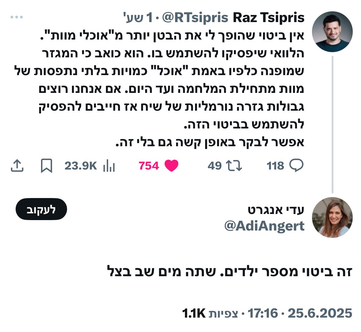 "אין ביטוי שהופך לי את הבטן יותר מ"אוכלי מוות". הלוואי שיפסיקו להשתמש בו. הוא כואב כי המגזר שמופנה כלפיו באמת "אוכל" כמויות בלתי נתפסות של מוות מתחילת המלחמה ועד היום. אם אנחנו רוצים גבולות גזרה נורמליות של שיח אז חייבים להפסיק להשתמש בביטוי הזה. אפשר לבקר באופן קשה גם בלי זה".