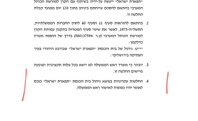 להחלטת הממשלה על העברת בית כנסת 'תפארת ישראל' לניהול של ידיים חרדיות נוסף סעיף שלא היה בהחלטה המקורית ונועד למנוע מחטפים.