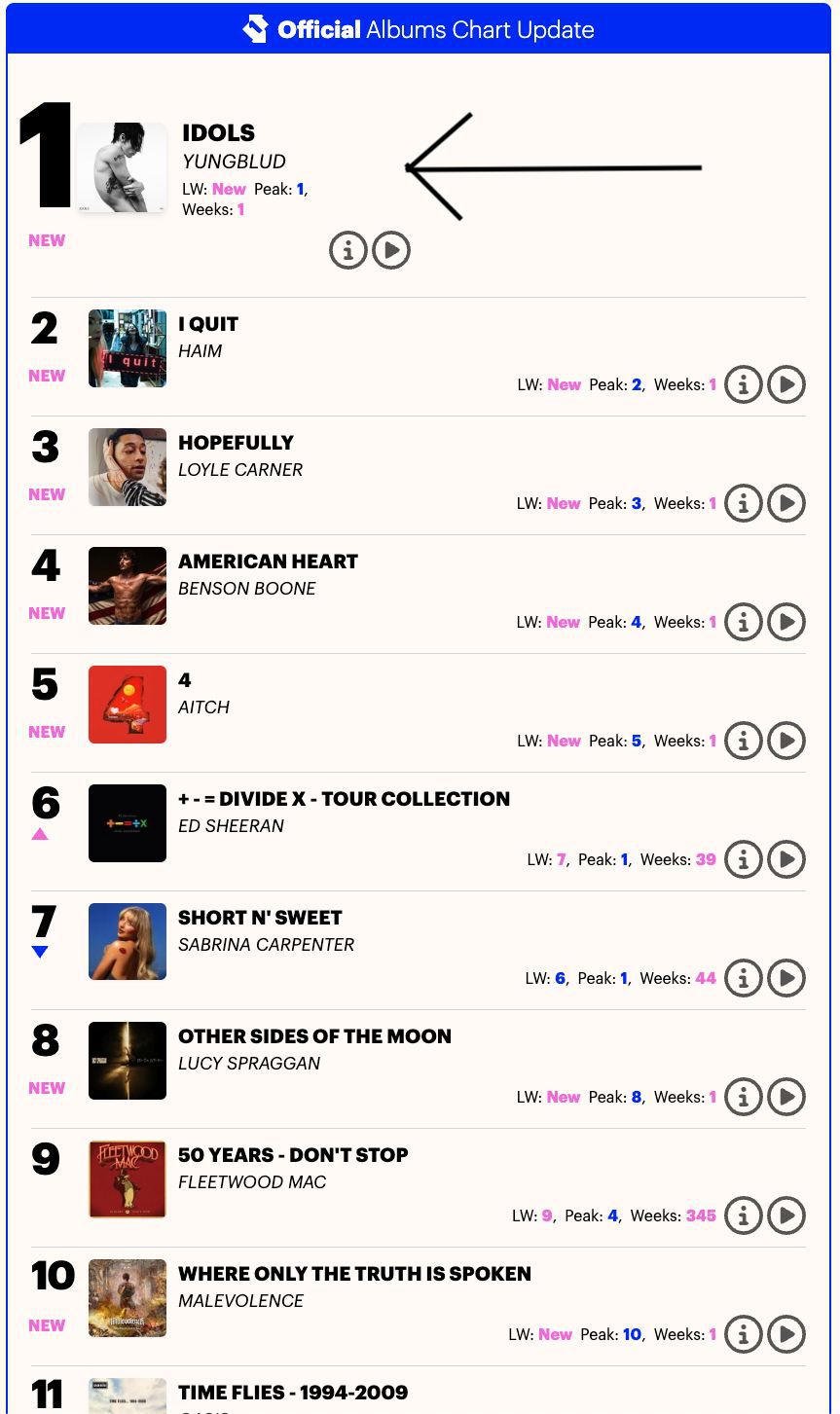 עולם המוזיקה הישראלית חוגג: האלבום החדש של YUNGBLUD (יאנגבלאד) הגיע למקום הראשון במצעד הבריטי – עם הפקה של מתי שוורץ ורון תיכון מישראל. האלבום של הזמר הבריטי, שנקרא Idols, הופק על ידי המפיק הישראלי מתי שוורץ ובהשתתפות המהנדס והמפיק המוזיקלי רון תיכון. הוא יצא ב-20 ביוני 2025 וזכה להצלחה מסחררת תוך שבוע בלבד.