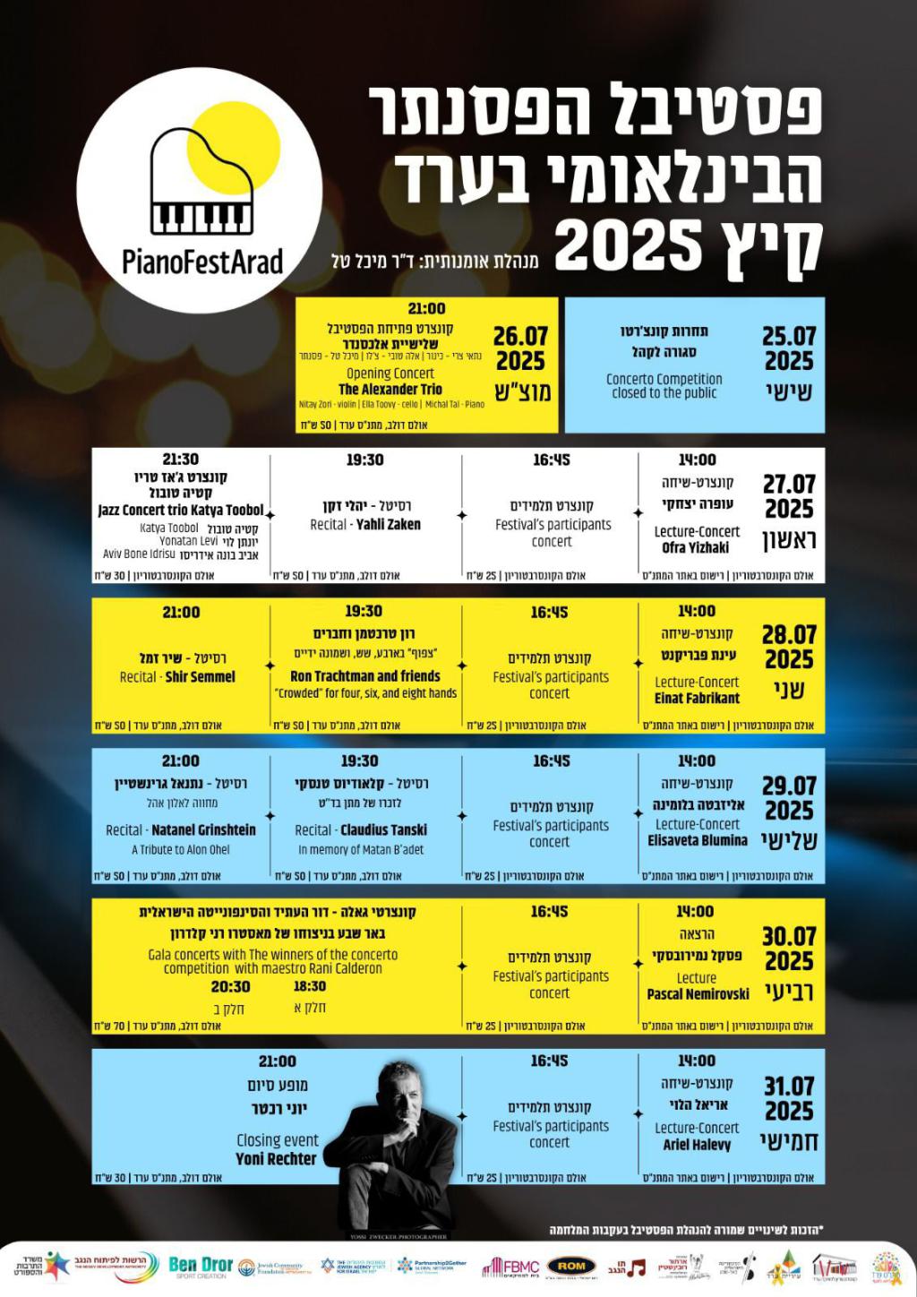 בין ה-25 ביולי ל-1 באוגוסט 2025, ערד תהפוך למרכז תרבותי בינלאומי עם PianoFestArad, הפסטיבל הבינלאומי לפסנתר. התוכנית כוללת קונצרטים עם אמנים מהשורה הראשונה מישראל ואירופה, כיתות אמן לנוער מוכשר, תחרות קונצ'רטו עם הסינפונייטה הישראלית באר שבע, הרצאות ומופעים פתוחים לקהל.