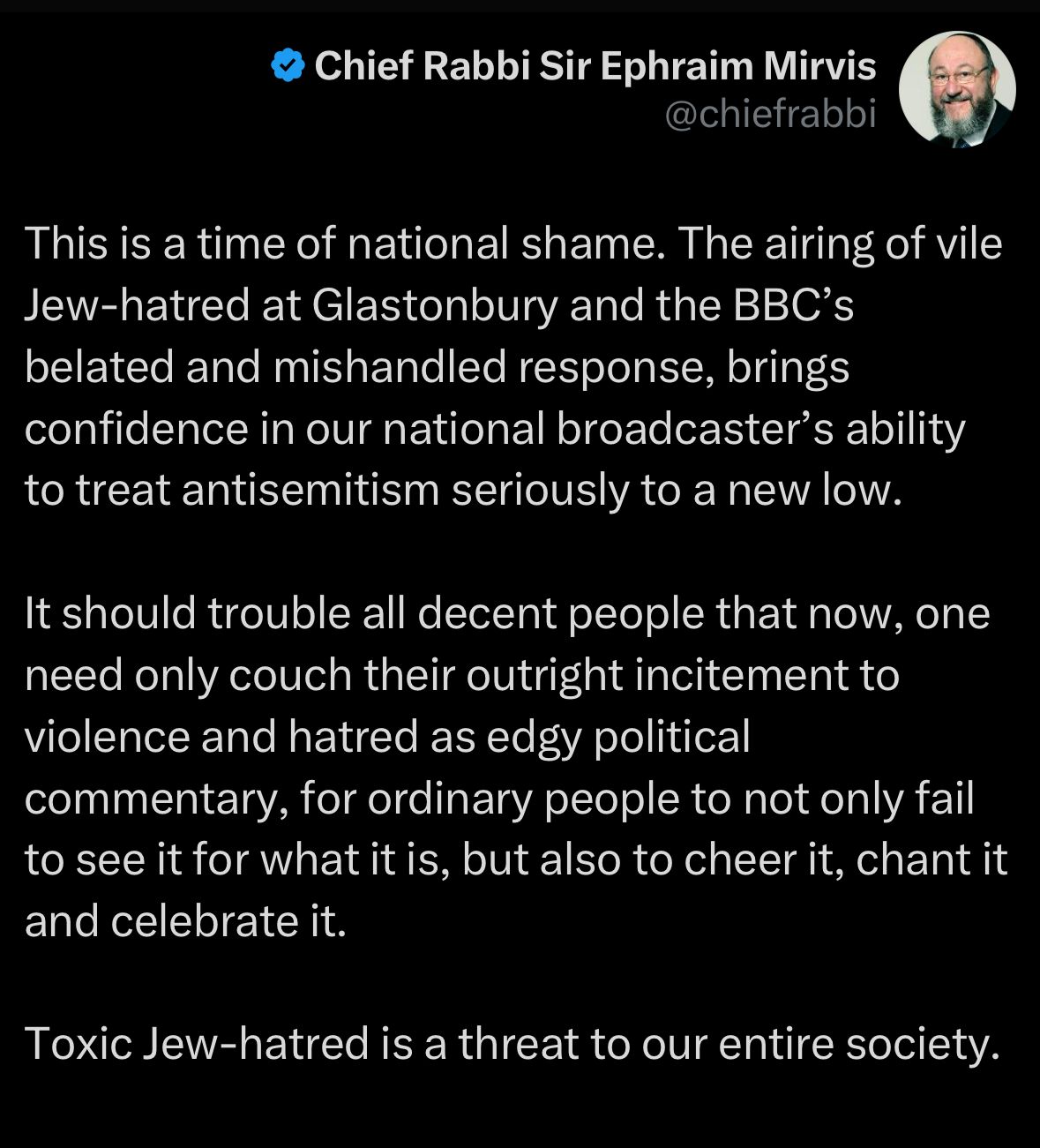 בפוסט ברשת X כתב הרב הראשי: "זהו רגע של בושה לאומית. שידור שנאת יהודים נתעבת בגלסטונברי, והתגובה המאוחרת והכושלת של ה-BBC, מביאים את האמון ביכולתה של רשת השידור הלאומית להוביל את אנטישמיות לשפל חדש."