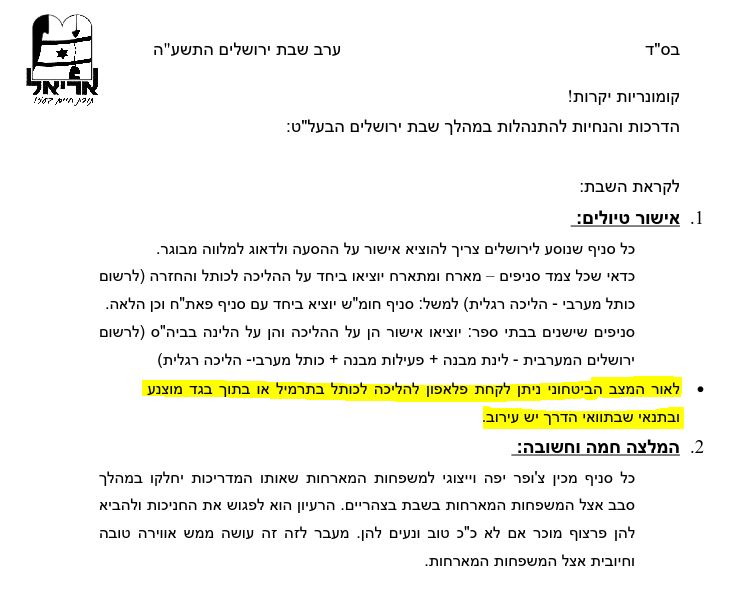 כהכנה לשבת, שיגרה התנועה מסמך הוראות לקומונריות ובו הדרכות והנחיות לקראת השבת כולל לוח זמנים מומלץ ודרישות בטחוניות לאישורים עבור הצעדה בירושלים. אחת מהן אומרת "ניתן לקחת פלאפון להליכה לכותל בתרמיל או בתוך בגד מוצנע ובתנאי שבתוואי הדרך יש עירוב".
