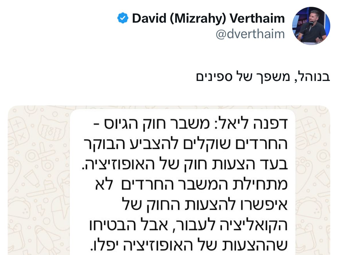 את העקיצה הזו הוא כתב בהקשר לכך שליאל כתבה הבוקר (רביעי) שהחרדים שוקלים להצביע בעד חוקי האופוזיציה, וזאת כאיום על המבשר בחוק הגיוס. כידוע, האיום לא התממש והחרדים חזרו בהם.