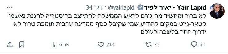 לפיד עצמו התייחס למתקפה של נתניהו על היועמ"שית וכתב: "לא ברור ומחשיד מה גורם לראש הממשלה להתייצב בהיסטריה להגנת נאשמי קטאר-גייט במקום להודיע שמי שקיבל כסף ממדינה ערבית תומכת טרור לא ידרוך יותר בלשכה לעולם".