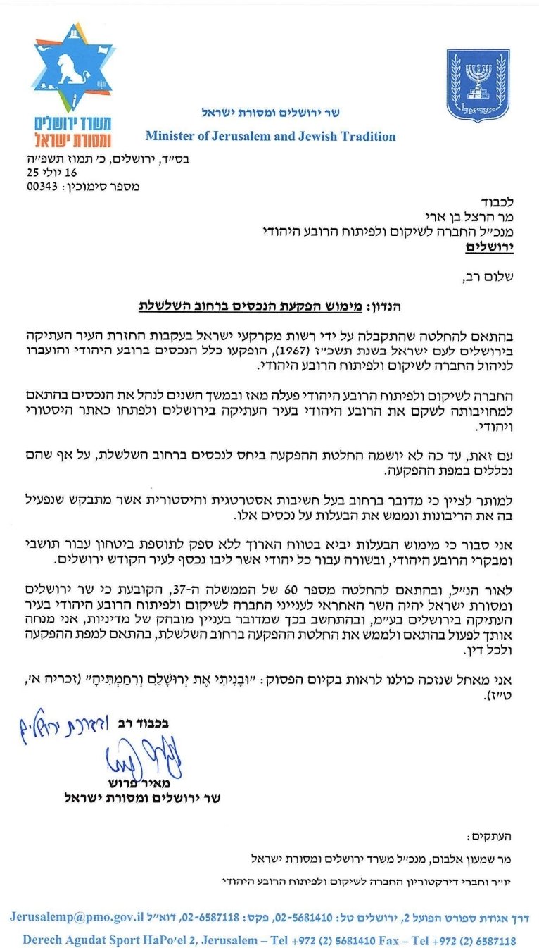 במכתב ששלח להרצל בן ארי הוא מורה לו לממש את החלטת הממשלה בנושא הפקעת החנויות ובסיום המכתב הוא הוסיף איחול: "אני מאחל שנזכה כולנו לראות בקיום הפסוק: 'ובניתי את ירושלים ורחמתיה", כשהוא מוסיף רפרנס כי הפסוק נלקח מהפסוק זכריה א',טז.