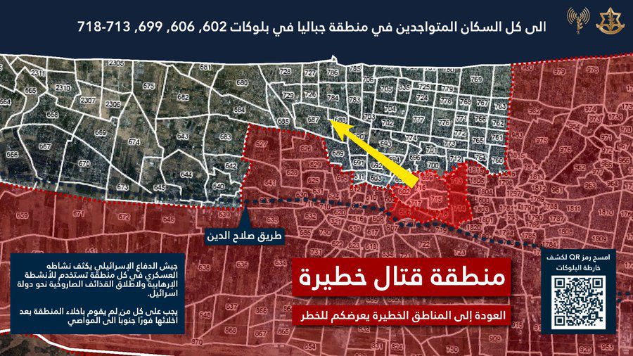 "לכל תושבי אזור ג'באליה בבלוקים 602, 606, 699, 713-718: צה"ל מגביר את פעילותו הצבאית בכל אזור המשמש לפעילות טרור ולשיגור רקטות לעבר מדינת ישראל" אמר אדרעי. "כל מי שלא פינה את האזור באופן מיידי חייב להתפנות דרומה, מעבר לנהר המוואסי".