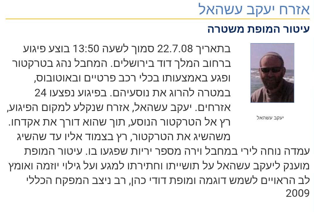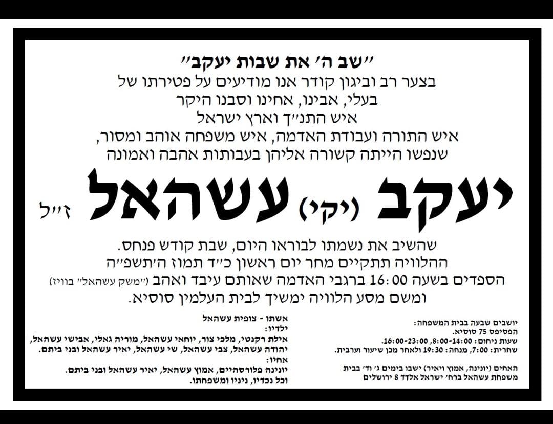 ברוך דיין האמת: השבת נפטר איש ההתיישבות יעקב (יקי) עשהאל, תושב היישוב סוסיא שבדרום הר חברון. עשהאל התפרסם בין היתר בכך שבשנת 2008 חיסל את המחבל בפיגוע הטרקטור השני בירושלים שהיה ברחוב המלך דוד בעיר. לאור תושייתו ופעילותו קיבל את עיטור המופת ממשטרת ישראל.