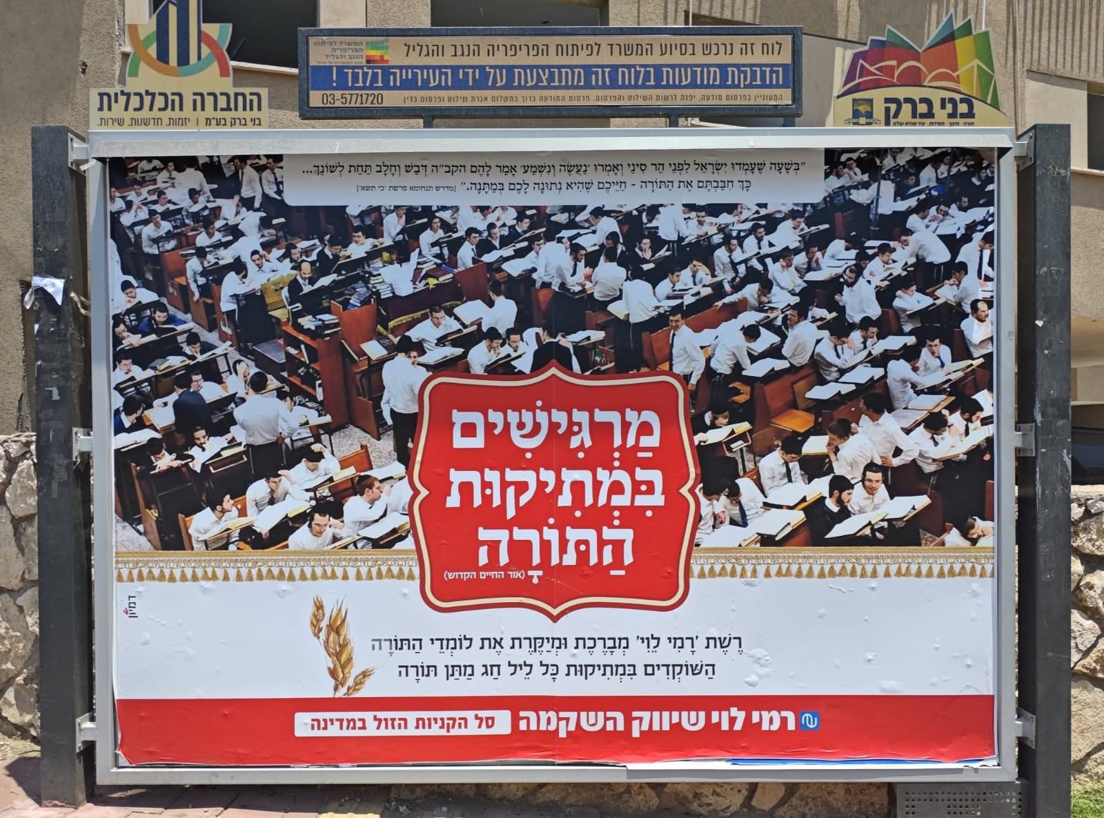 בתמונה: פרסום לקראת חג השבועות לכבודם של לומדי התורה שהיה צריך להיות בכל עיר בישראל מאחר ורוב הציבור פחות מעריך את לומדי התורה, אז הפרסום הזה פורסם דווקא בבני ברק. זה הזמן לחזק את לומדי התורה מכל המגזרים. תגדילו תורה ותאדירו.