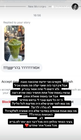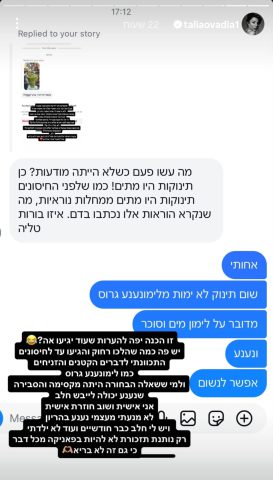 טליה שיתפה סטורי בו כתבה: "פיזית הכוס השלישית שהזמנתי, מה זה החום הזה?" התמונה הציגה כוס לימנענע גרוס מרעננת. אך תגובה מפתיעה של עוקבת שינתה את הטון: "אסוררררר בהיריוןןןןן!!"