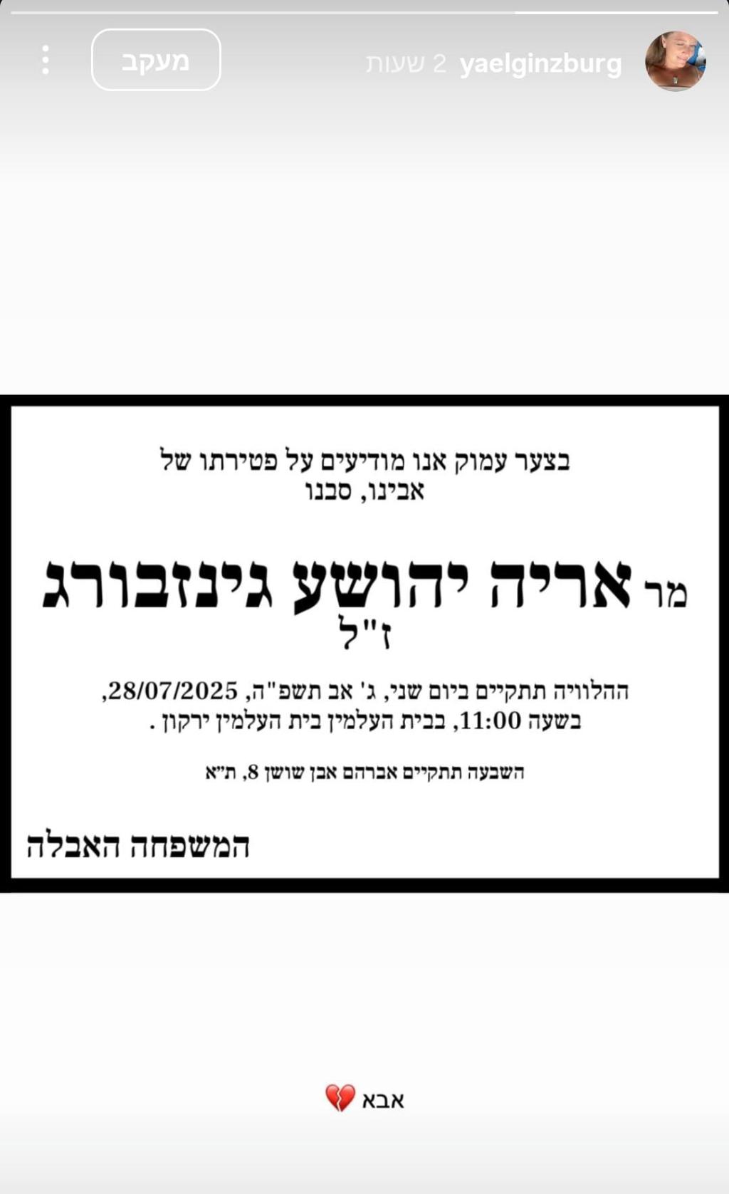מודעת אבל, מתוך האינסטגרם של יעל גינזבורג