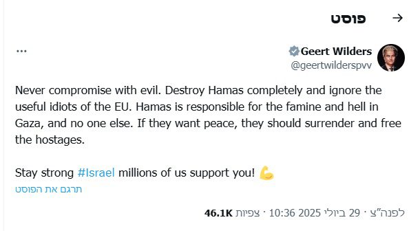 בפוסט, שנכתב בשפה האנגלית, כתב וילדרס (בתרגום חופשי): "לעולם אל תתפשרו עם הרוע. השמידו את חמאס לחלוטין והתעלמו מהאידיוטים השימושיים של האיחוד האירופי. חמאס אחראי לרעב ולגיהנום בעזה, ולא אף אחד אחר. אם הם רוצים שלום, עליהם להיכנע ולשחרר את בני הערובה. הישארי חזקה ישראל, מיליונים מאיתנו תומכים בך!" כתב וילדרס.