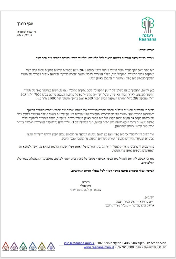עיריית רעננה רואה חשיבות עליונה בדאגה לכל תלמידות ותלמידי העיר ובתוכם תלמידי בית ספר נועם. בית ספר נועם הפך להיות מוסד חינוכי עירוני רשמי בשנת 2023 ומאז מקדמת העירייה תוכנית להקמת מבנה קבע ראוי ומתקדם עבור תלמידיו. לשמחתנו, בעקבות פעולות העירייה ומאמציה מול משרד החינוך, התקבל באחרונה אישור רשמי ממשרד החינוך וההכרה הרשמית בצורך בהקמתו. לנוכח קבלת האישור העקרוני, תוכל העירייה להתחיל בפועל בהקמת המבנה, זאת, בכפוף להעברת משרד החינוך את התקציב להקמתו.