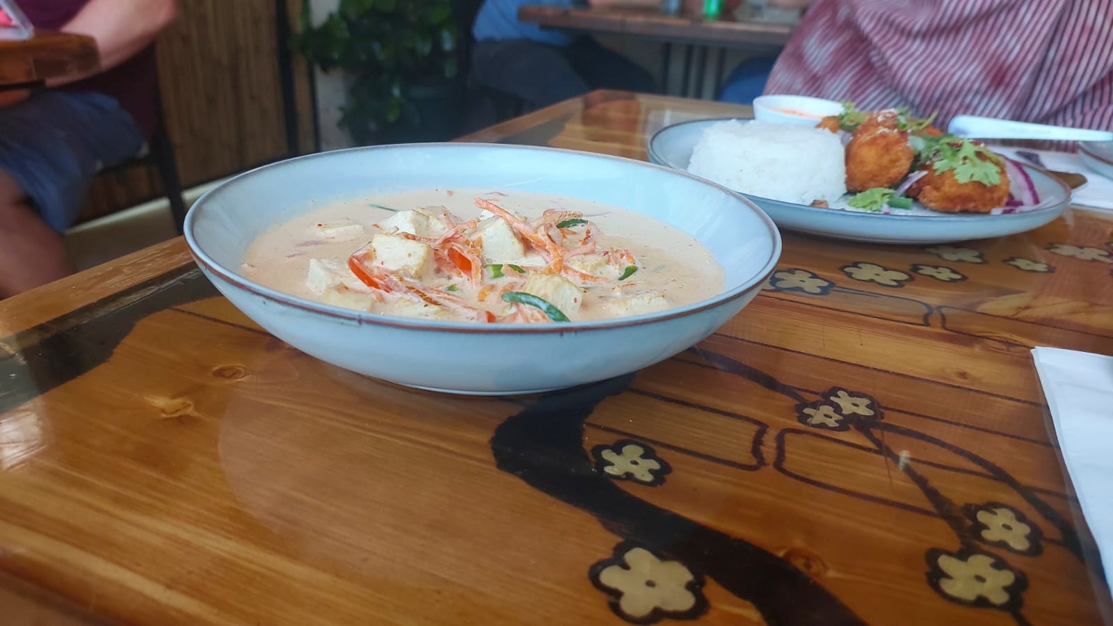 לאחר העצירה המרעננת, המשכנו לארוחת צהריים. במרחק של פחות מחמש דקות נסיעה, בתוככי המושב בני ראם, פתחו בני הזוג אילן ונעמה ידעי מסעדה תאילנדית אותנטית כשרה (רבנות, עופות מהדין, בשר חלק) העונה לשם הפשוט "התאילנדית הכשרה". אמנם לבושתי (או שמא לשמחתי) לא הייתי מיימי בתאילנד, כך שאני לא באמת יודע להשוות את האווירה והאוכל למקור, אך נראה שהשקיעו בעיצוב ובאווירה, כולל בכלים ובשולחנות על מנת ליצור אווירה תאילדית למקום. ולא סתם.
