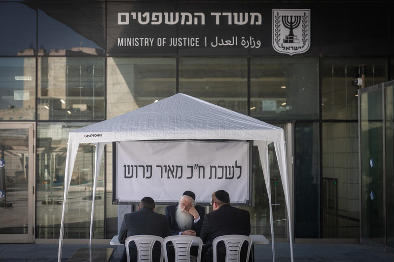 השר לשעבר, ח"כ מאיר פרוש הקים את לשכתו בכניסה למשרד המשפטים כמחאה נגד "היועמ"שית שמובילה את רדיפת עולם התורה" כדבריו, ומסר לקול ברמה: "חייבים לעשות צעדי מחאה נוספים בכדי לבטל את גזירת הגיוס. כל הציבור החרדי ערוך ודרוך לקראת צעדים עליהם יחליטו גדולי ישראל".