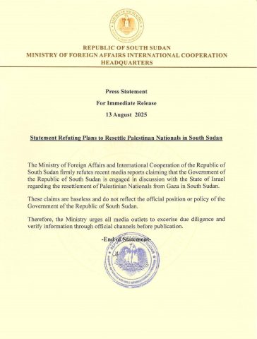 בהודעה רשמית שפורסמה על ידי משרד החוץ של ממשלת דרום סודן נמסר: "משרד החוץ הדרום סודני מכחיש ומפריך כל קשר לדיווחים האחרונים על מגעים עם ממשלת ישראל, בנושא מיקום מחדש של פלסטינים ועזתים".