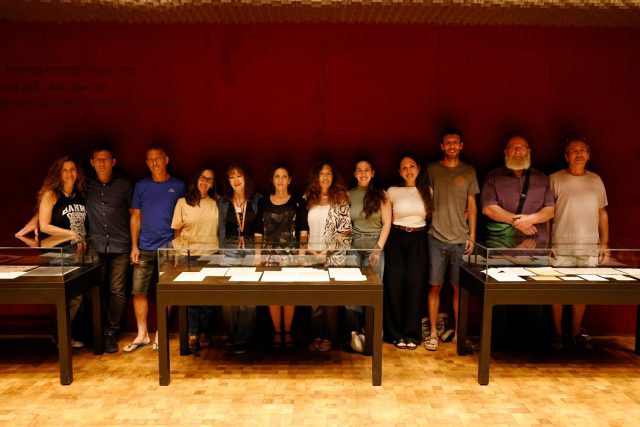 ילדיה של רותיק נוסבאום (אחותה של נעמי שמר) עם מילות השיר המקורי בספריה הלאומית. (צילום: אורי ברקת. הספריה הלאומית)