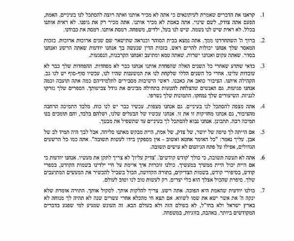 במכתב, המטיח ברב האשמות חמורות, נכתב בין היתר: "קראנו את הדברים שאמרת לעיתונאים כי אתה לא מכיר אותנו ואתה רוצה להסתכל לנו בעיניים. האמת, הפעם אתה צודק לשם שינוי. אתה באמת לא מכיר אותנו. אתה מכיר רק את גופנו. לא ראית אותנו בכלל. לא ראית שיש לנו נשמה. שיש לנו בעל, ילדים, משפחה. רמסת אותנו. רמסת את כבודנו".